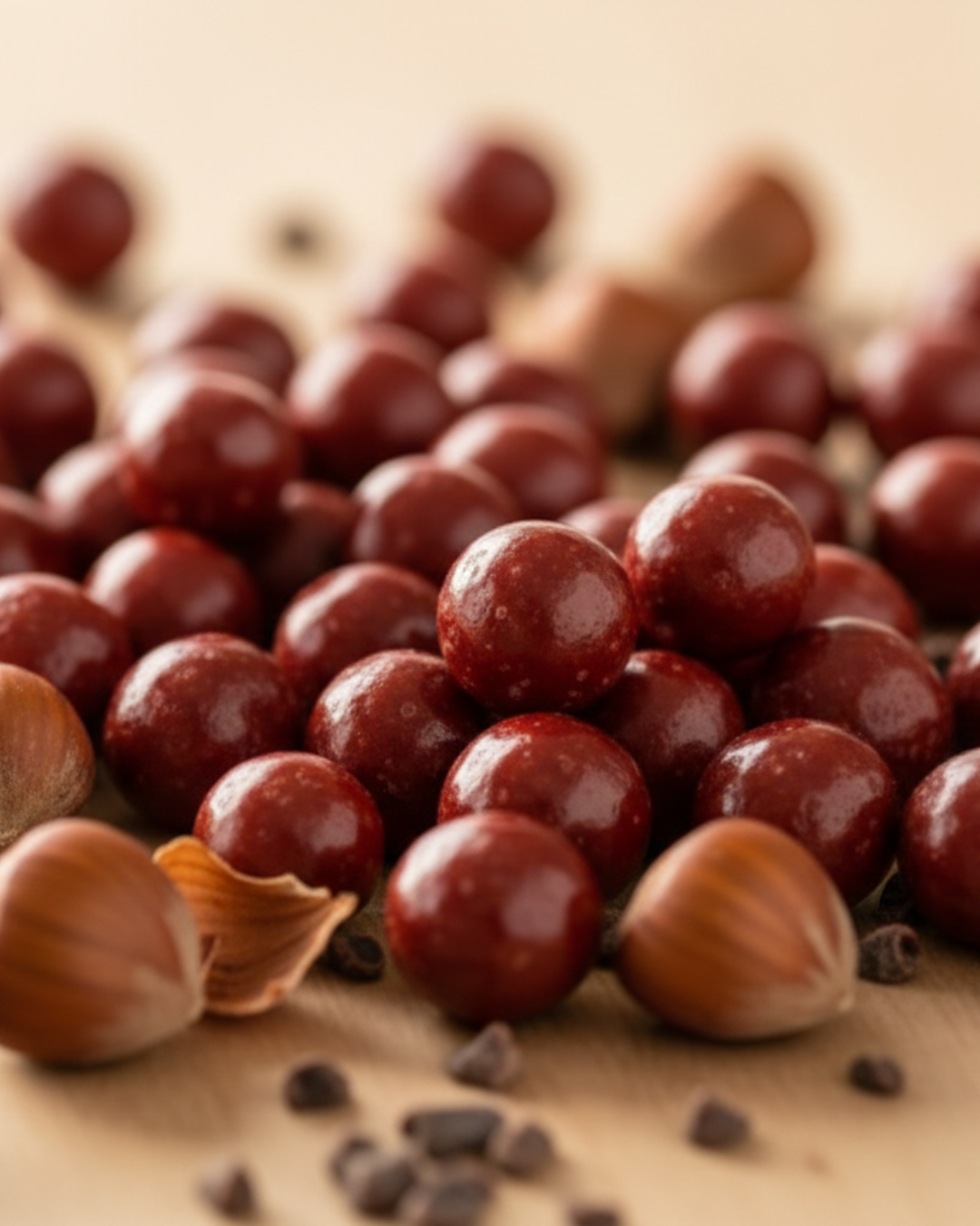 Avellanas tostadas cubiertas caramelizadas y bañadas en chocolate de leche