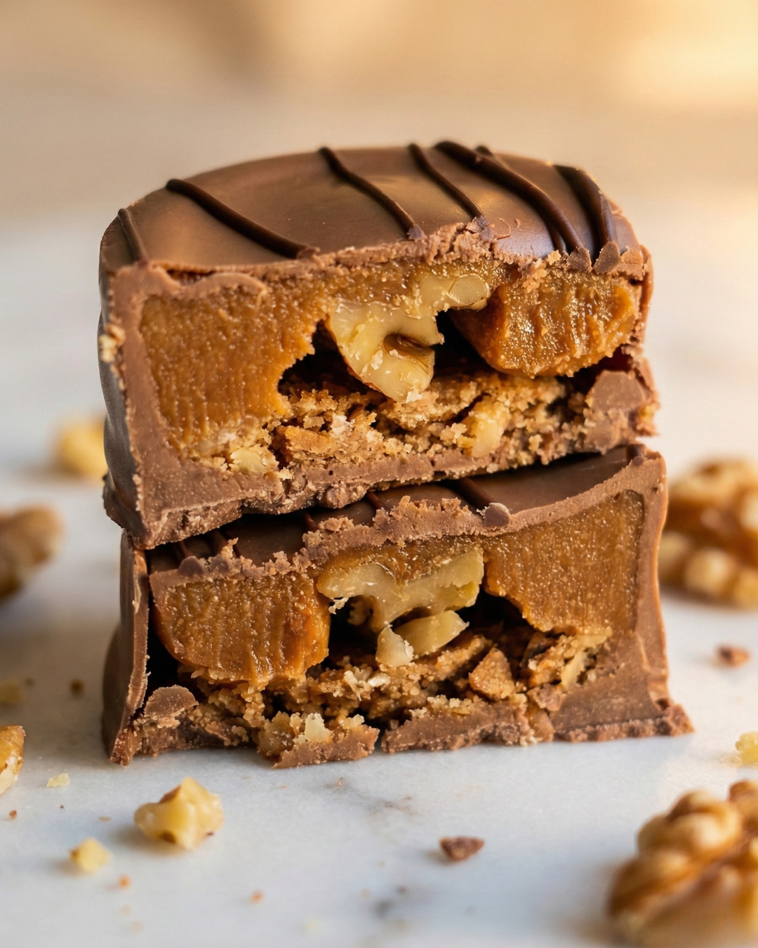 Para los amantes del caramelo: relleno de caluga blanca, galleta de nuez artesanal y una nuez entera al medio, bañada en chocolate de leche. Textura perfecta entre crocante y suave.