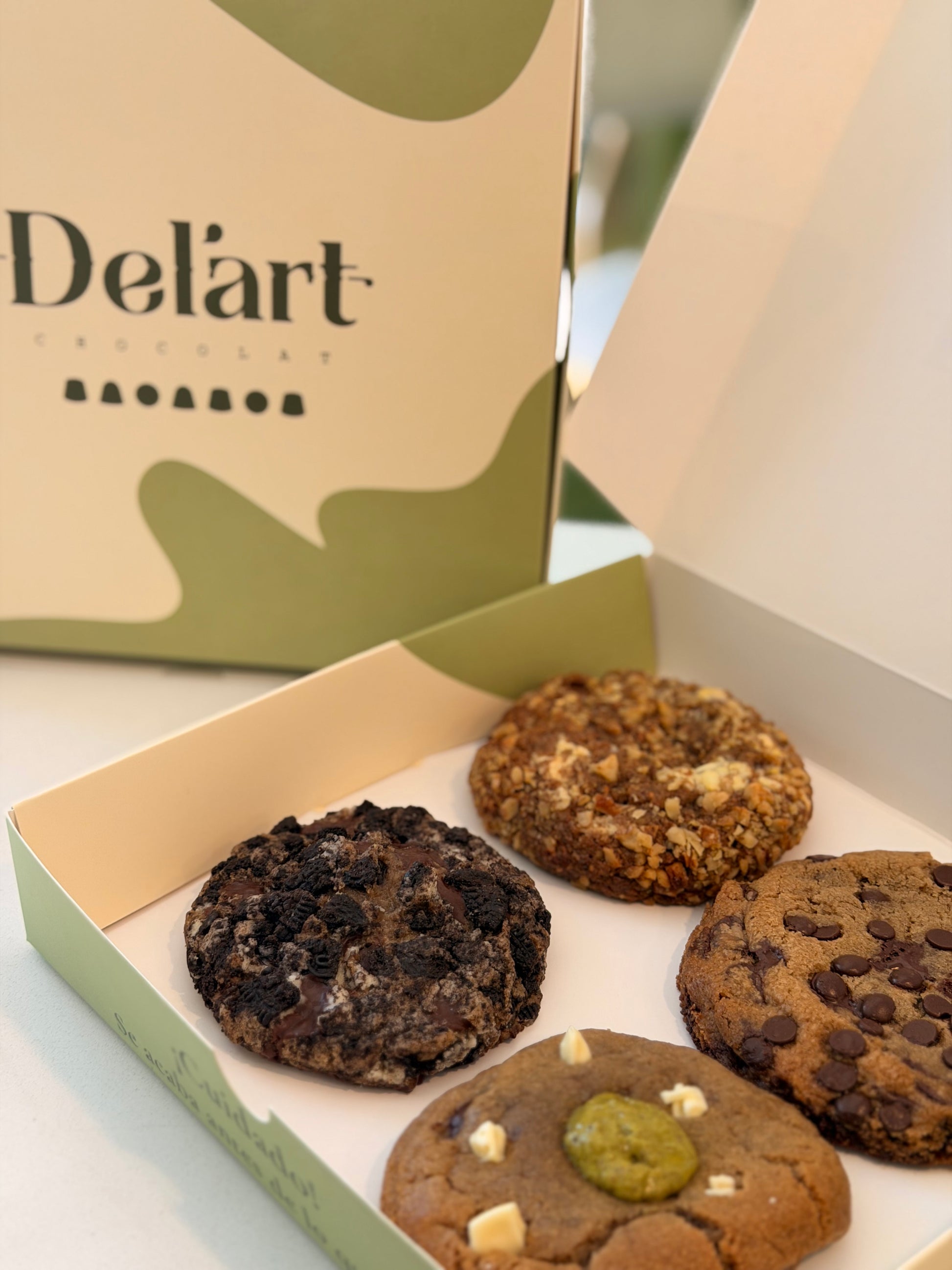 Cookie pistacho: Galletas rellenas de crema de pistacho y chips de chocolate belga cacao 54.5%.