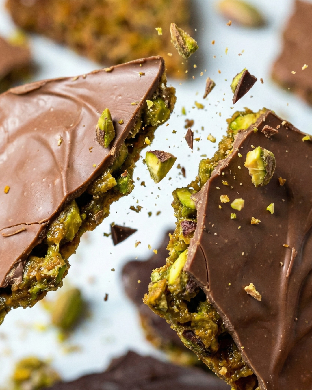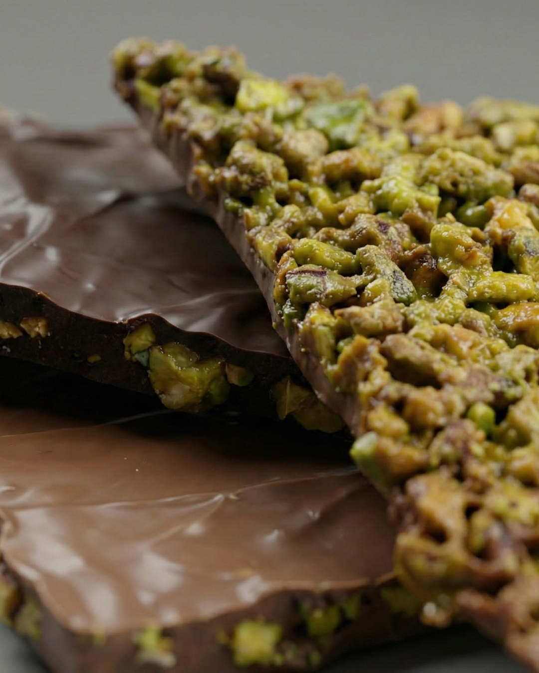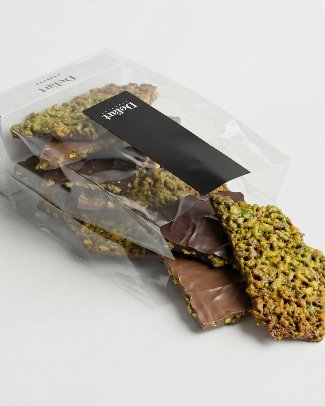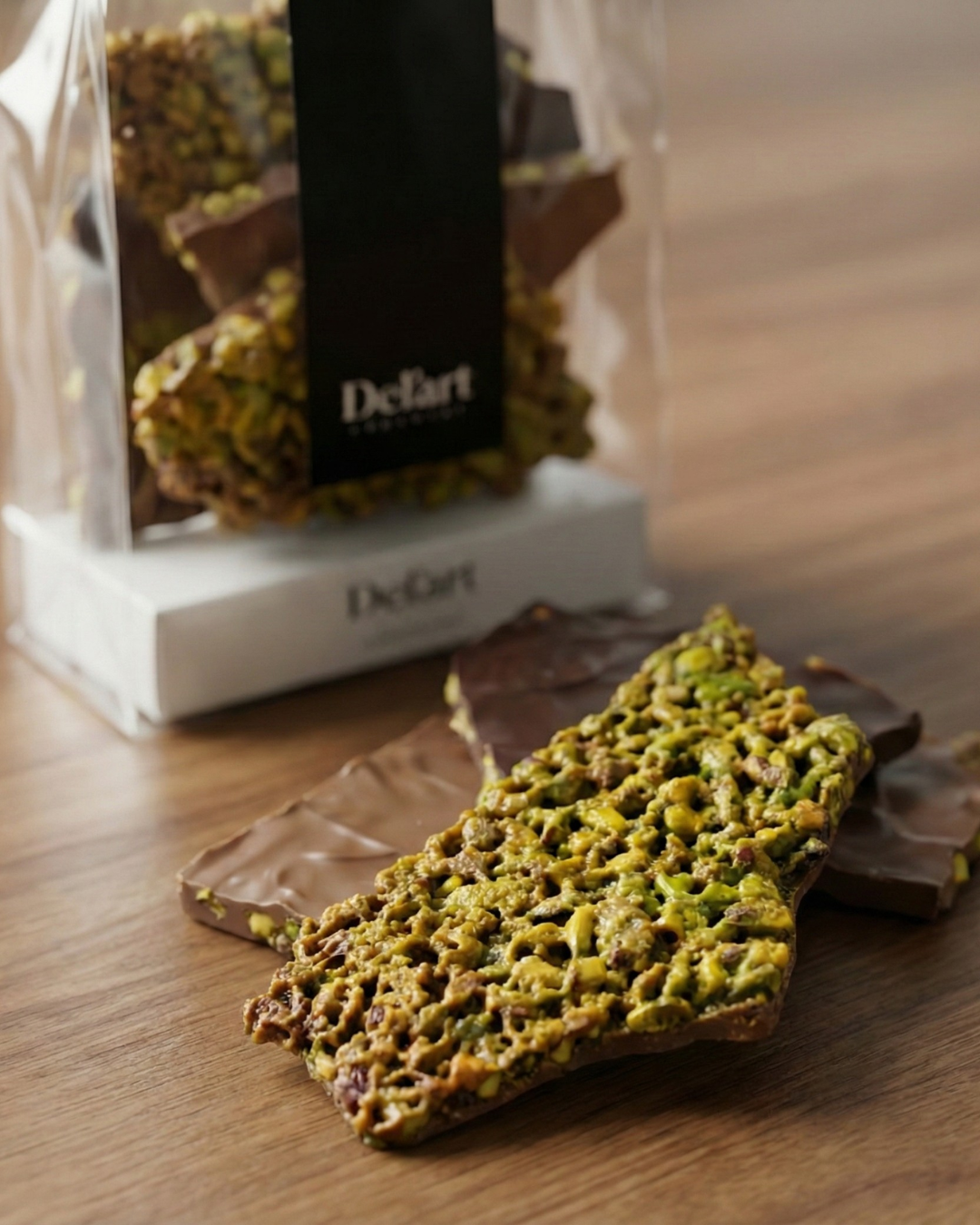 Pistacho picado caramelizado en formato tableta con una fina lámina de chocolate de la mejor calidad.